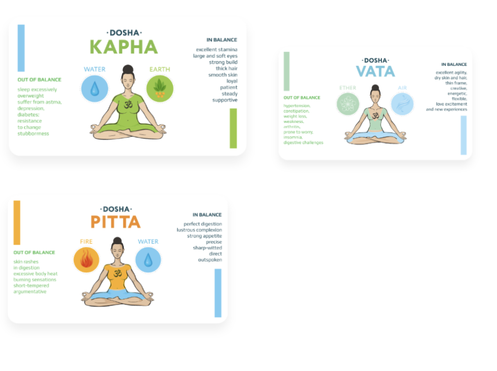 The combination of these elements are three doshas (tridosha): Vata, Pitta, and Kapha, and their balance is unique to each individual. When this doshic balance is disturbed it creates disorder resulting in disease.